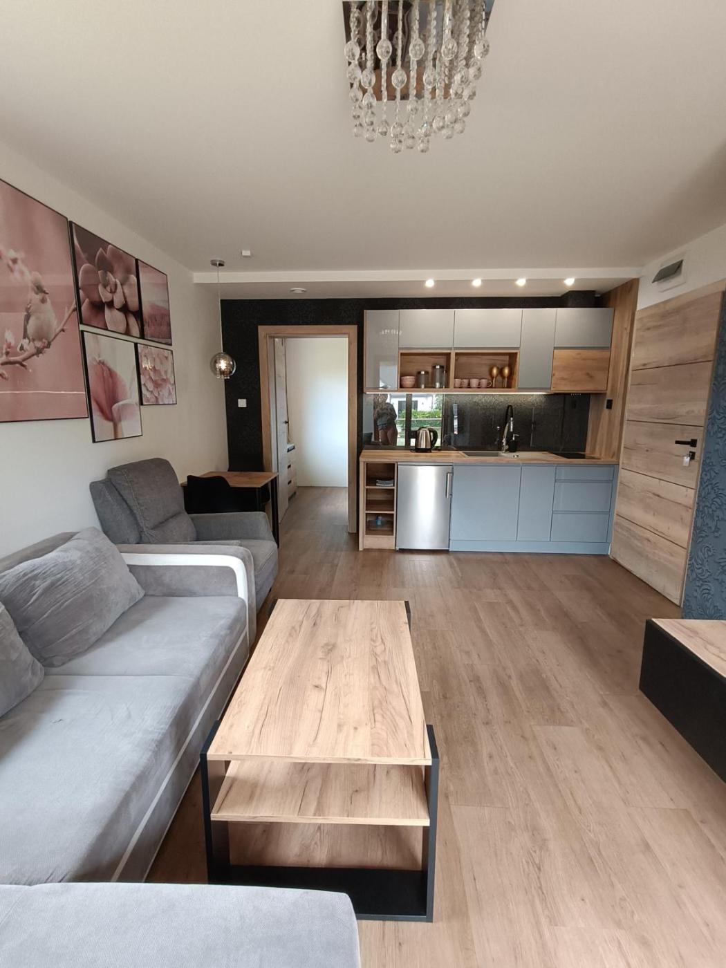 Apartament typu studio. The apartment offers a seating area, a dining area, as well as a private bathroom featuring a shower and a hairdryer. Guests will find a stovetop, a refrigerator, kitchenware and a microwave in the kitchenette. The apartment also provides guests with a barbecue. The apartment provides a washing machine, soundproof walls, a coffee machine, a flat-screen TV with cable channels, as well as garden views. The unit offers 2 beds. Apartament - 4 osobowy. Powierzchnia pokoju ok.: 30 mkw.