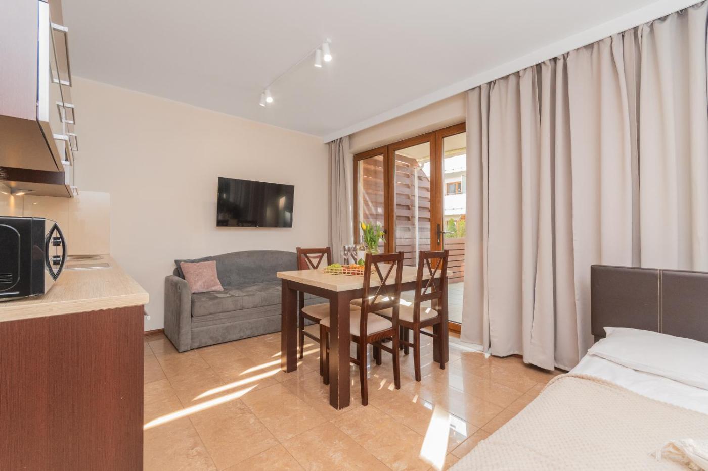 Studio. The studio features a dining area, a wardrobe, as well as a private bathroom boasting a walk-in shower and a hairdryer. In the well-equipped kitchenette, guests will find a stovetop, a refrigerator, kitchenware and an electric kettle. Featuring a balcony, this studio also offers a sofa, heating and a flat-screen TV. The unit has 2 beds. Studio - 4 osobowy. Powierzchnia pokoju ok.: 24 mkw.