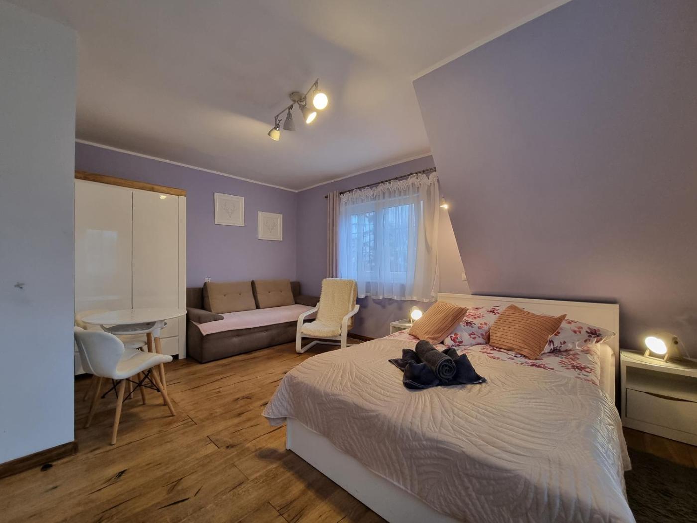 Pokój czteroosobowy typu Standard. The quadruple room features parquet floors, heating, as well as a private bathroom boasting a shower. The quadruple room offers a flat-screen TV, a wardrobe, an electric kettle, a barbecue as well as garden views. The unit has 2 beds. Pokój Czteroosobowy - 4 osobowy. ;
